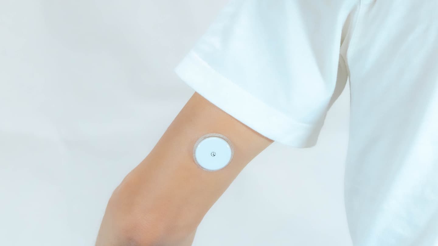 二の腕にセンサーを取り付けると、2週間にわたり間質液のグルコース濃度を1分毎に測定します。そのデータをご自身のスマホアプリを通してチェックすることができます。